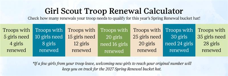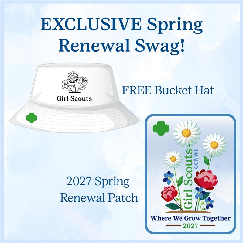 As a special thank-you, troops that have 80% of their entire girl membership renewed by May 31, 2026, will receive our EXCLUSIVE Spring Renewal bucket hat for all renewed girls and *volunteers. Eligible members will receive pick-up details by email in early June.